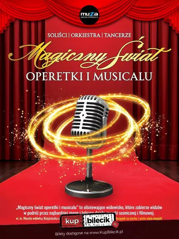 Zapraszamy na wyjątkowy mikołajkowy wieczór pełen muzyki, wzruszeń i niezapomnianych emocji! "Magiczny świat operetki i musicalu" to olśniewające widowisko, które zabierze widzów w podróż przez najbardziej znane i ukochane dzieła muzyki scenicznej i filmowej. W programie znajdą się największe przeboje operetkowe - pełne emocji arie, duety i ensemble z takich dzieł jak: Wesoła wdówka, Bal w Savoyu, Księżniczka Czardasza, Ptasznik z Tyrolu, Hrabina Marica. Usłyszymy również poruszające i energetyczne utwory z musicali: My Fair Lady, Cats, Dzwonnik z Notre Dame, Skrzypek na dachu, Piloci.